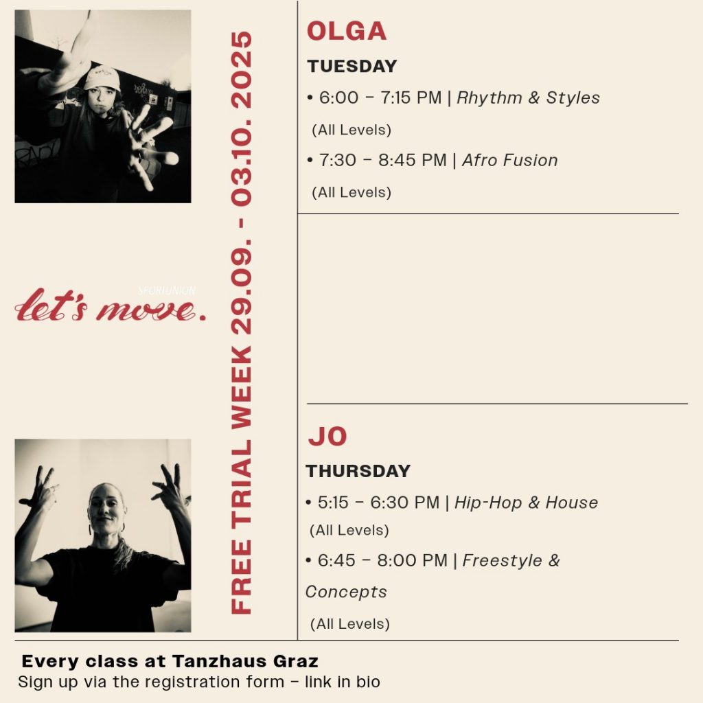 Der Verein Sportunion Let’s Move ist ein gemeinnütziger Verein, der es sich zum Ziel gesetzt hat, Kindern, Jugendlichen und Erwachsenen die Welt des Tanzes und der HipHop-Kultur näher zu bringen. In unserem breiten Angebot finden sich aber auch andere Tanzstile wie Dancehall & Afro Fusion.